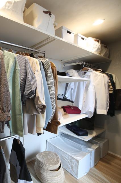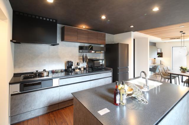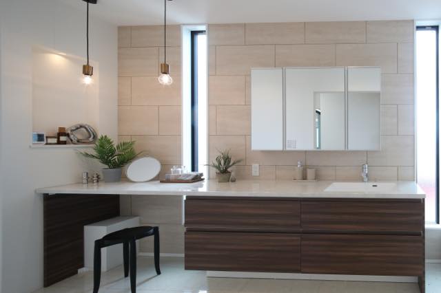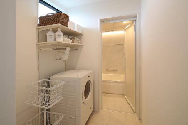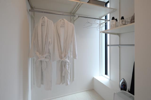料理する人の動きを考えたパントリー付きのキッチン。そこからすぐの浴室、ランドリールーム、洗面所と並んだ奥にはウォークインクローゼット。毎日使うコートやバッグ、その季節の衣類などは洗ってここに収納。毎日2階のクローゼットまで運ぶ必要はありません。家事が効率的になると家族と過ごすゆとりの時間が生まれます。
